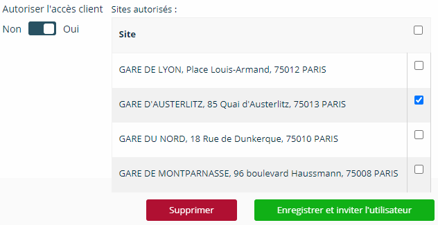 Il suffit d’activer la fonction par le bouton et de sélectionner les sites qui vous souhaitez rendre accessible au détenteur. Dans notre exemple seul le site de la Gare d’Austerlitz sera accessible :