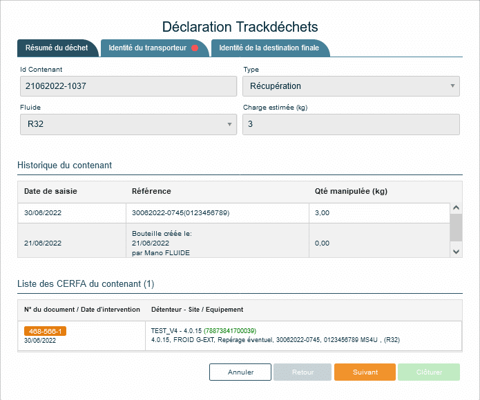 Remarques : une fois la connexion activée, toutes les clôtures de contenants de type « Récupération », c’est-à-dire les contenants qui contiennent des déchets fluides au sens de la réglementation, généreront la création d’un Bordereau de Suivi des Fluides Frigorigènes (BSFF) dans la plateforme étatique Trackdéchets.