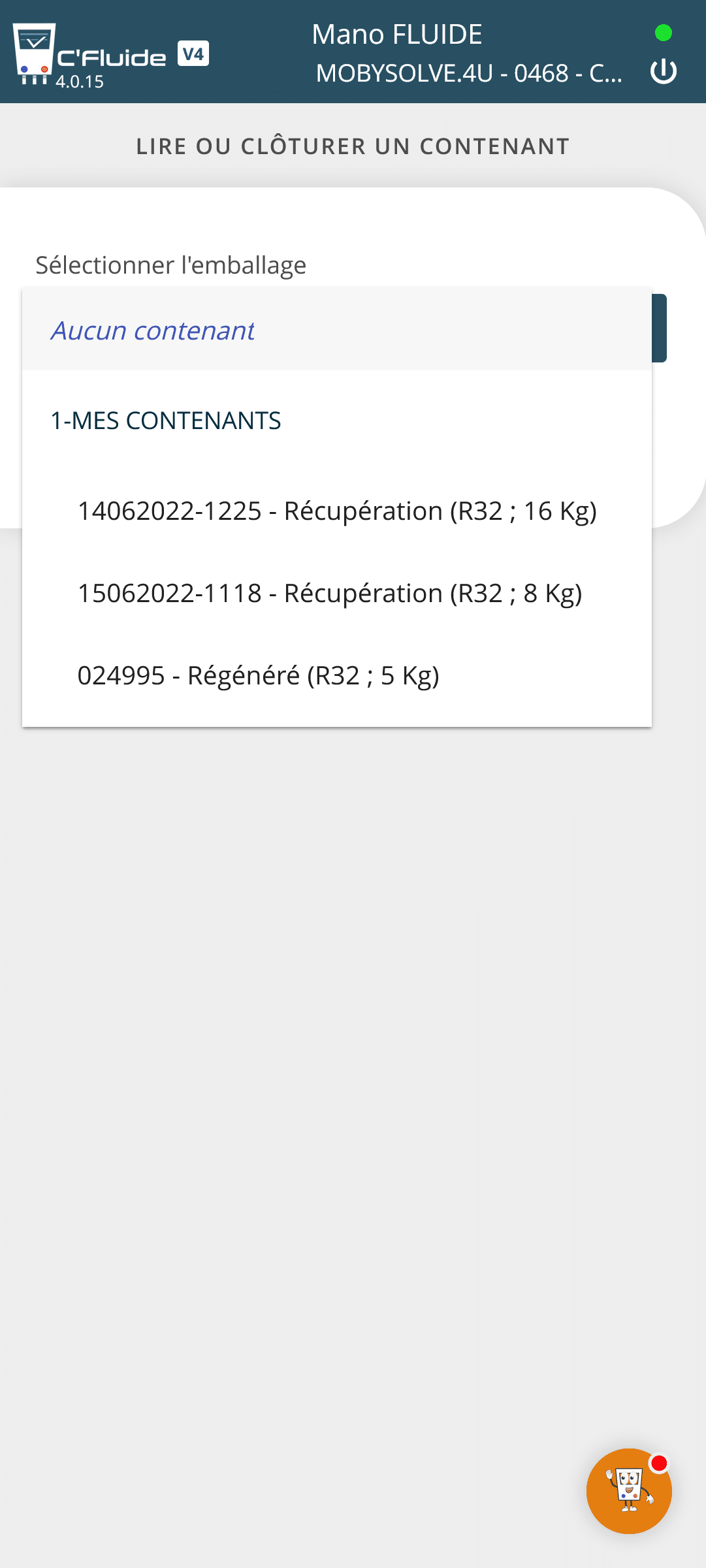 Dans la rubrique Gérer des contenants, je sélectionne le contenant de type Récupération que je souhaite clôturer et restituer à mon fournisseur. Une fois le contenant sélectionné, le déroulé est identique à celui du Back Office